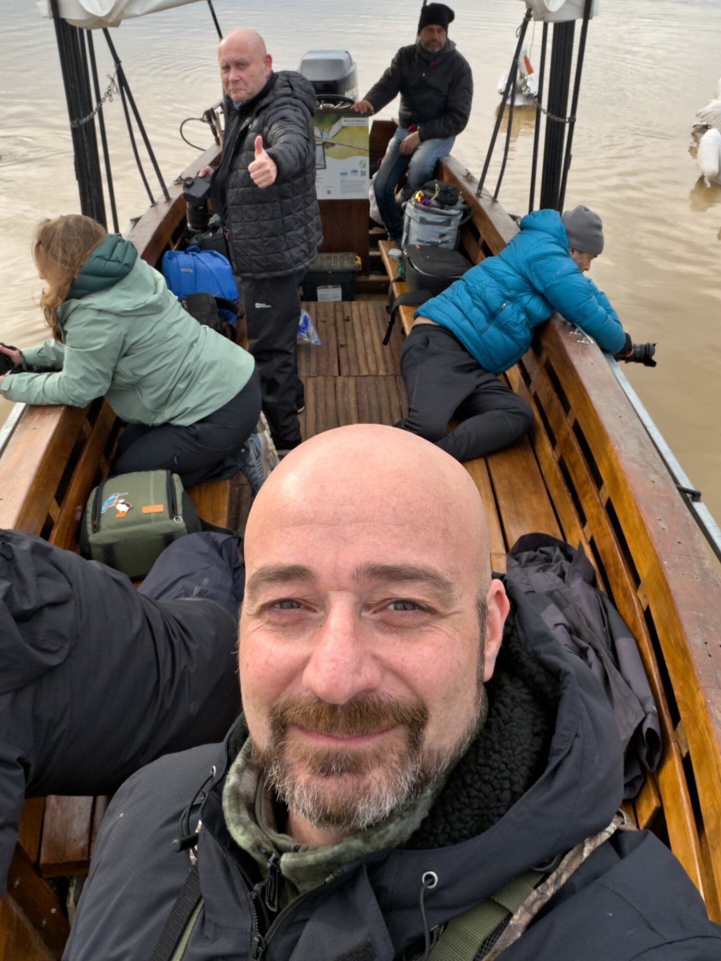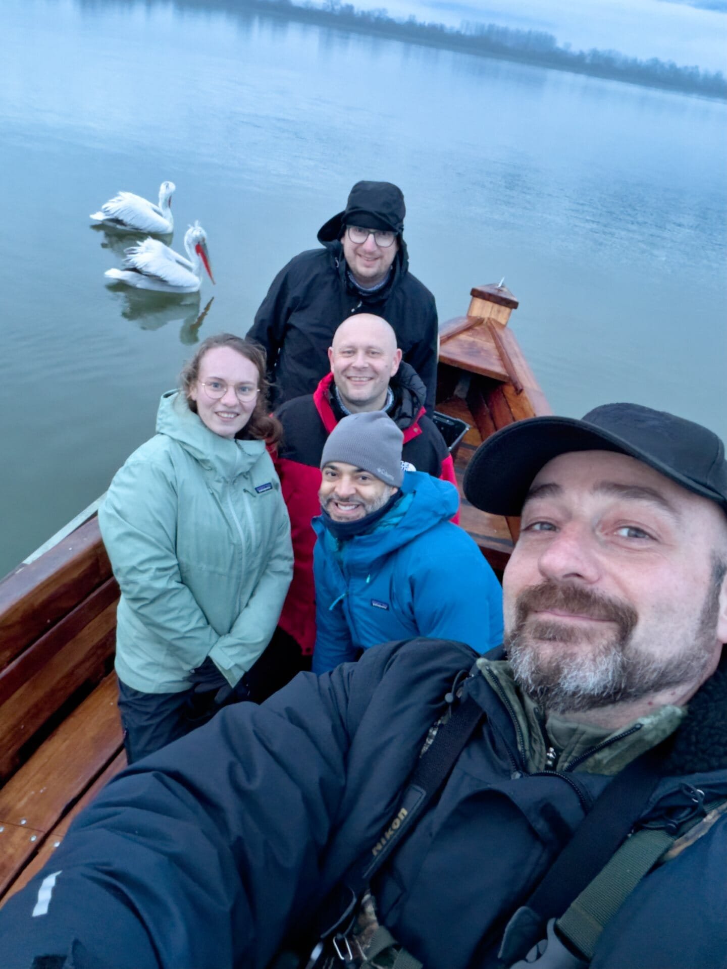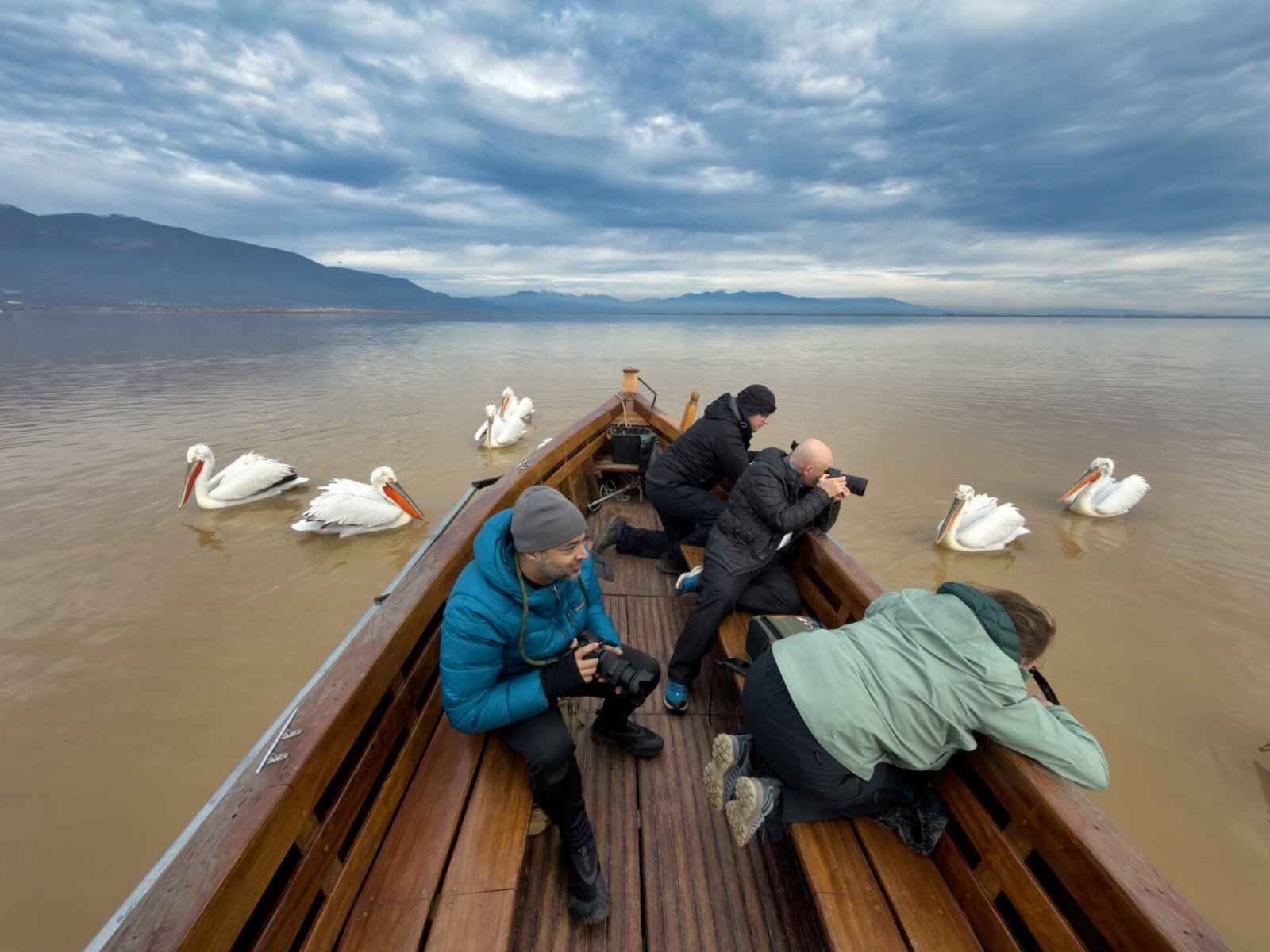 The latest Kingdom of the Pelicans group at Lake Kerkini became something more than a workshop. It was five photographers from different parts of the world—Adam from Poland, Bianca, Herman (Dutch, based in London), Orlando from New York, and myself—standing in the same boat, under the same winter sky, responding to the same wild moments.