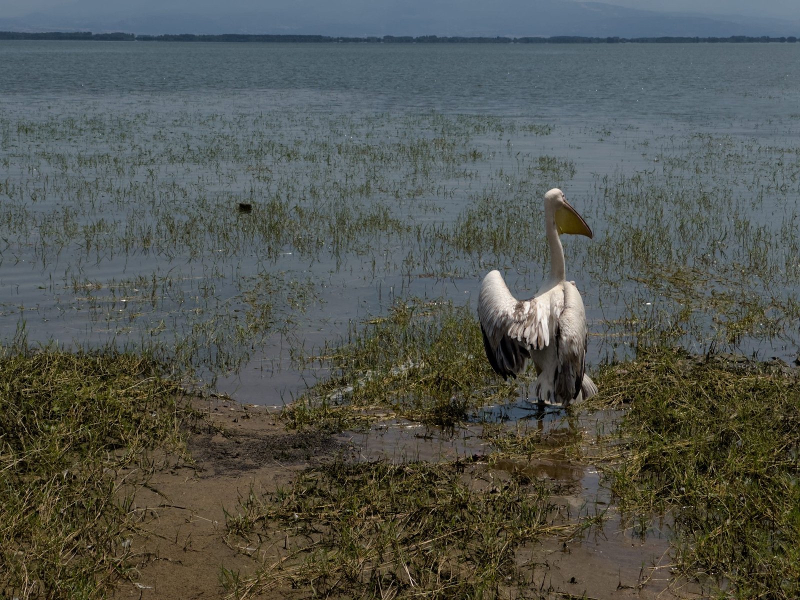 Ο πελεκάνος παρέμεινε ήρεμος και ακίνητος, ίσως εκμεταλλευόμενος την ευκαιρία να ξεκουραστεί.