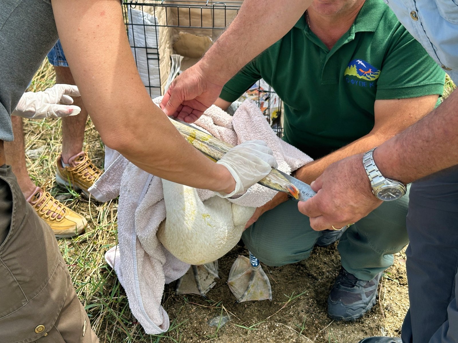 Η ομάδα του Ο.ΦΥ.ΠΕ.Κ.Α., του παραρτήματος στη λίμνη Κερκίνη, σημάδεψε τα πόδια του πελεκάνου και τον άφησε ελεύθερο. Λόγω του τραυματισμού στο φτερό, αποφάσισαν να μην βάλουν ετικέτα στα φτερά ή να τοποθετήσουν πομπό. Μετά την απελευθέρωση, ο πελεκάνος φαινόταν χαλαρός, τεντώνοντας τα φτερά του πριν κολυμπήσει μακριά.